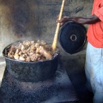 Anyhow, there we were, sitting on our superbly narrow, hard benches, and every so often along came an invigorating breeze, wafting the tantalizing smell of roasting pig meat into our appreciative nostrils! Occasionally we were distracted from the interesting sermon by this not too unwelcome scent! Gaudi and two of the boys, Emman Dan and Otto Ubong were cooking the pork over an open fire. They had gotten up around 4 or 5 to butcher the sow. Before church, which starts at 10, I had peeped in to see what they were up to; they had all the pieces cut and deboned. After church, I grabbed the camera and went back to look again. This pail contained the guts, what we would use to make wurst. I think so anyway. Don’t we use cow gut to make wurst? Well, they made pepper soup with it. They made me try a piece so I did just to say I did it. Reminding myself that I eat it when I eat our sausage at home, I tentatively chewed on a piece of the gristly gutsβ¦; well, it was ok enough, if a tad slimy. It tasted like the peppers and spices they put into the broth. Needless to say the boys liked it very much! I then took home some of the bones that